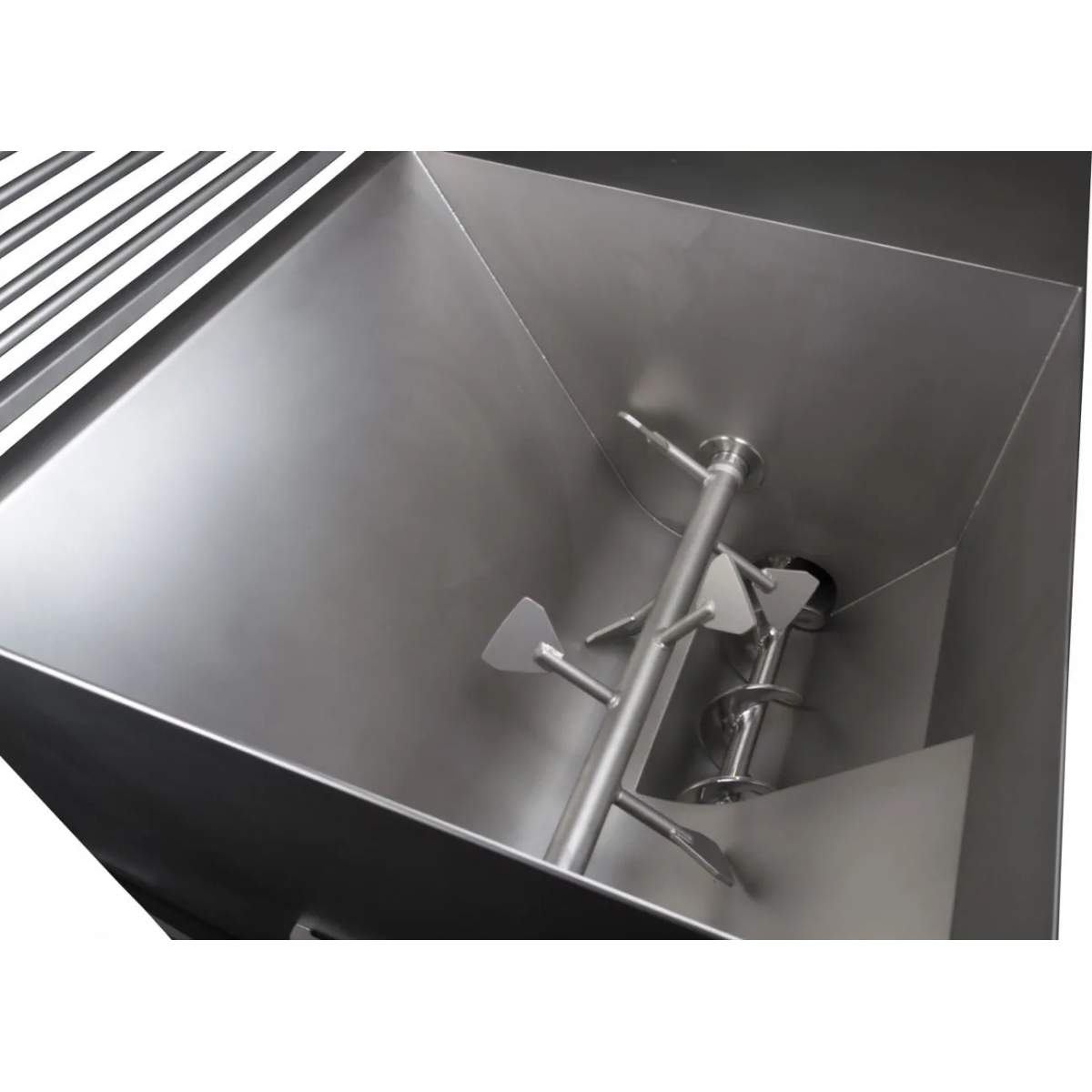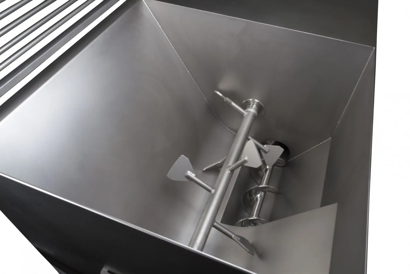 Бункер предварительного перемешивания в 360 литров снабжен перемешивателем, направление вращения которого может меняться вместе с направлением вращения подающего шнека для эффективного перемешивания.