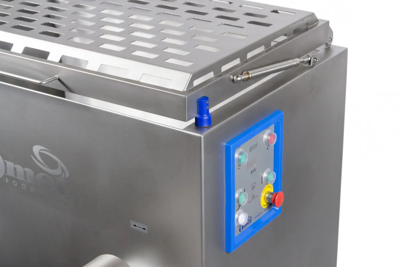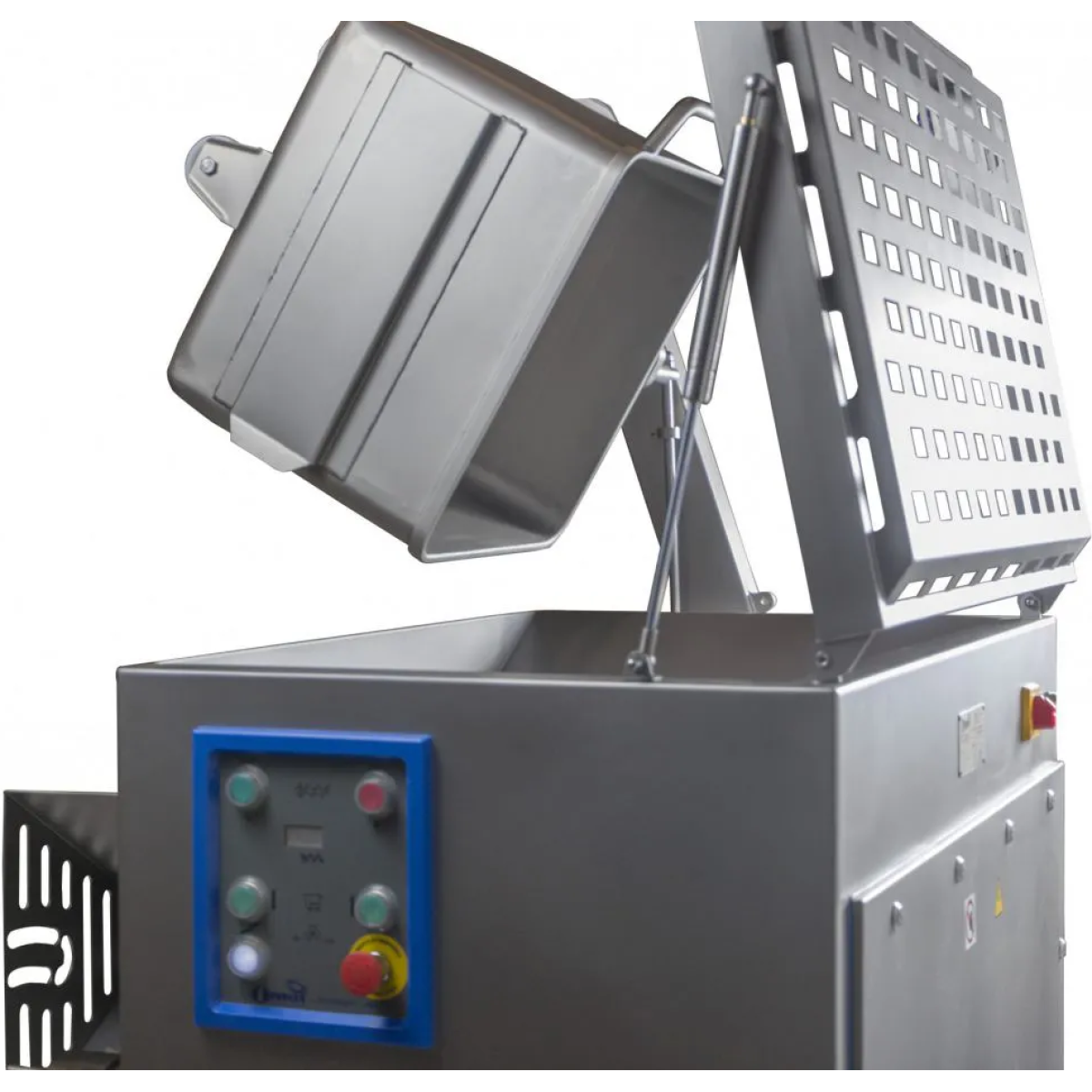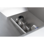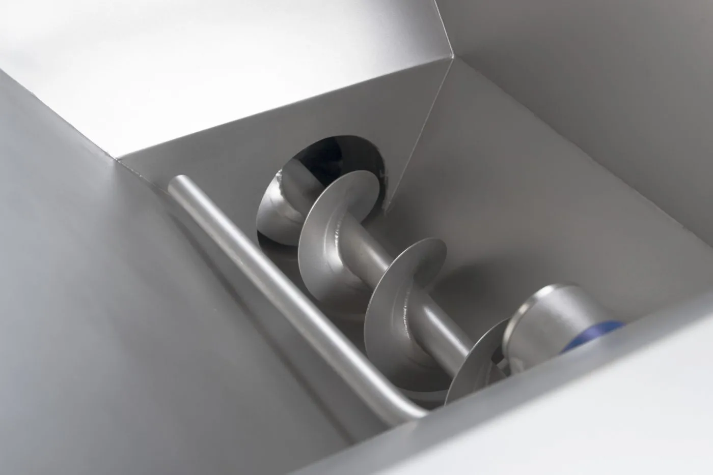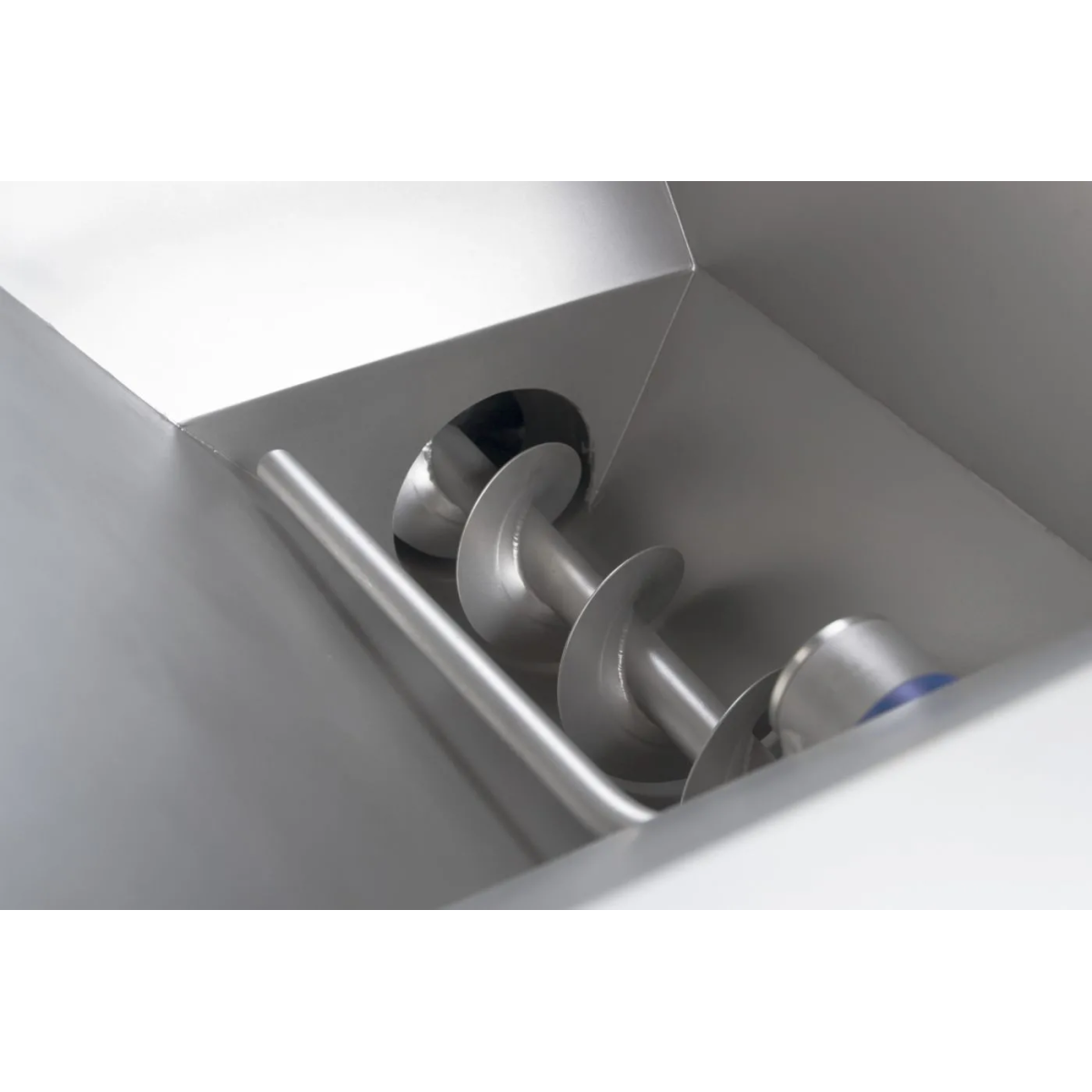 Вместительный бункер, снабженный защитной крышкой, позволяет легко загрузить продукт для перемалывания. Подающий шнек с регулируемой скоростью (опция), установленный под углом к рабочему шнеку, легко снимается для быстрой чистки.