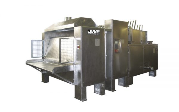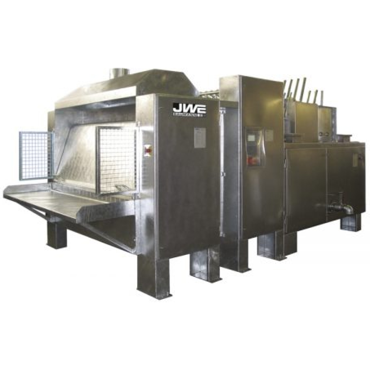После ошпарки туши автоматически транспортируются в скребмашину, где выполняется обезволашивание постоянным скоблением, орошением водой и опалкой. После этого туши ещё раз промываются водой, скоблятся в сухом виде и выталкиваются.