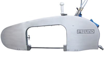Специализированная электрическая ленточная пила для распиловки на полутуши КРС. Форма пилы позволяет ей проникать даже в самые узкие пространства между разногами и пашиной туш. Пила поставляется в комплекте с трансформатором и балансиром для подвеса.