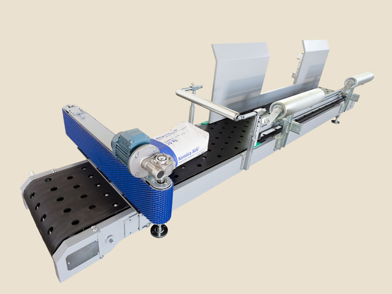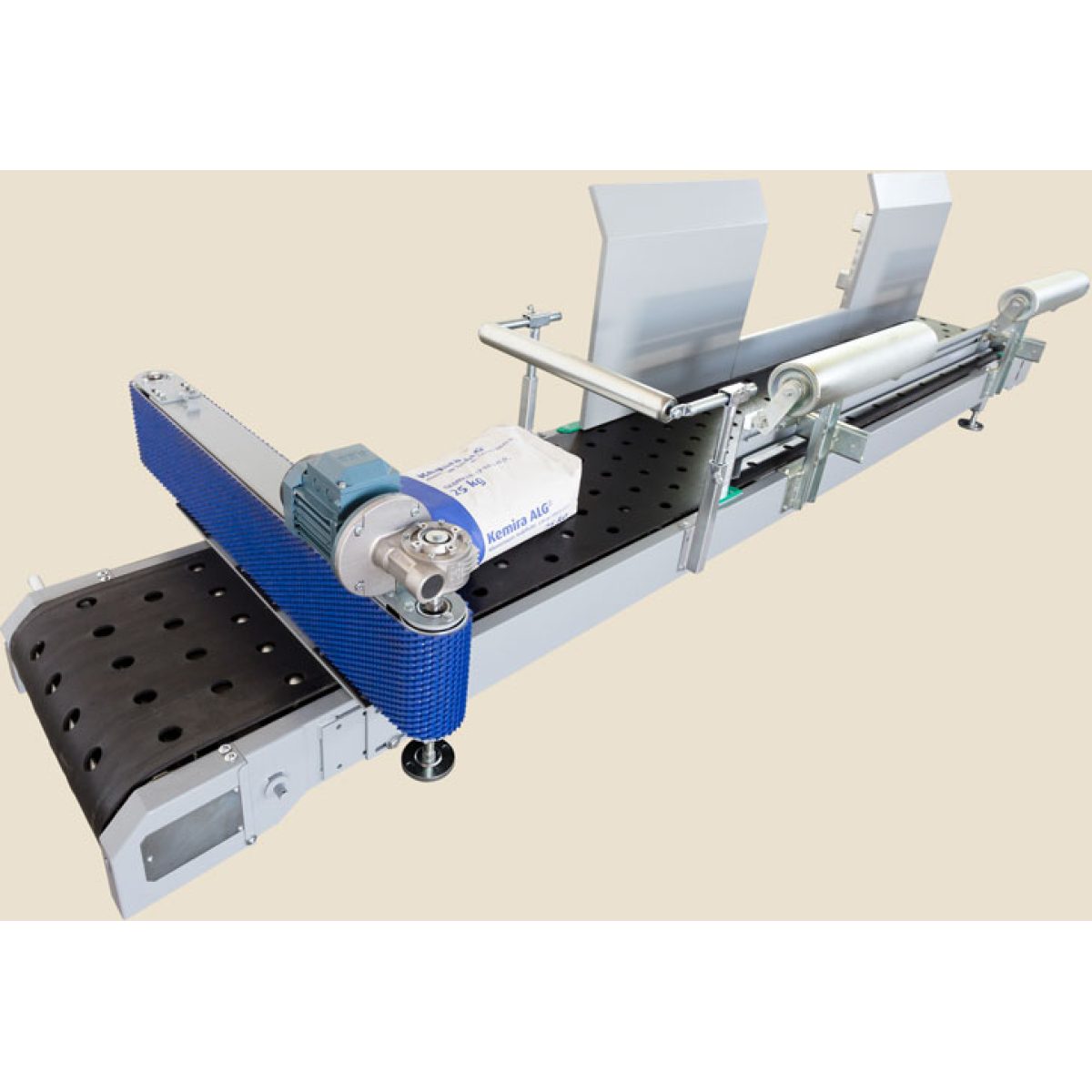 Транспортерная линия со сдавливанием мешка, для мешков или коробок, в комплекте с лентами и поворотами, для любого угла и направления.