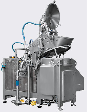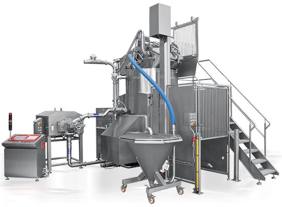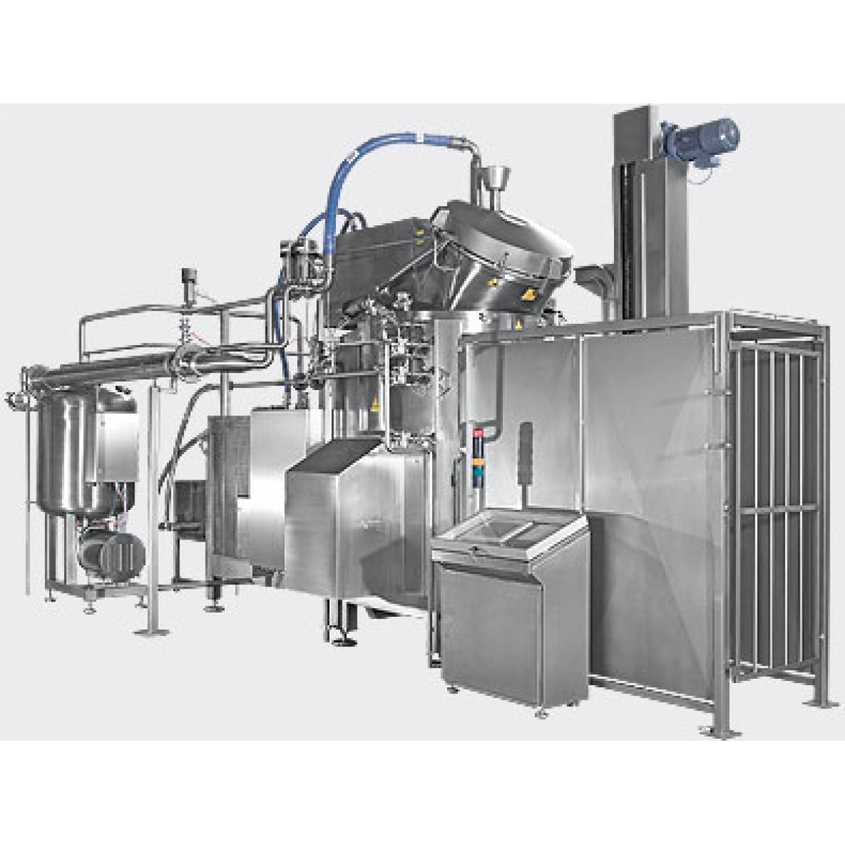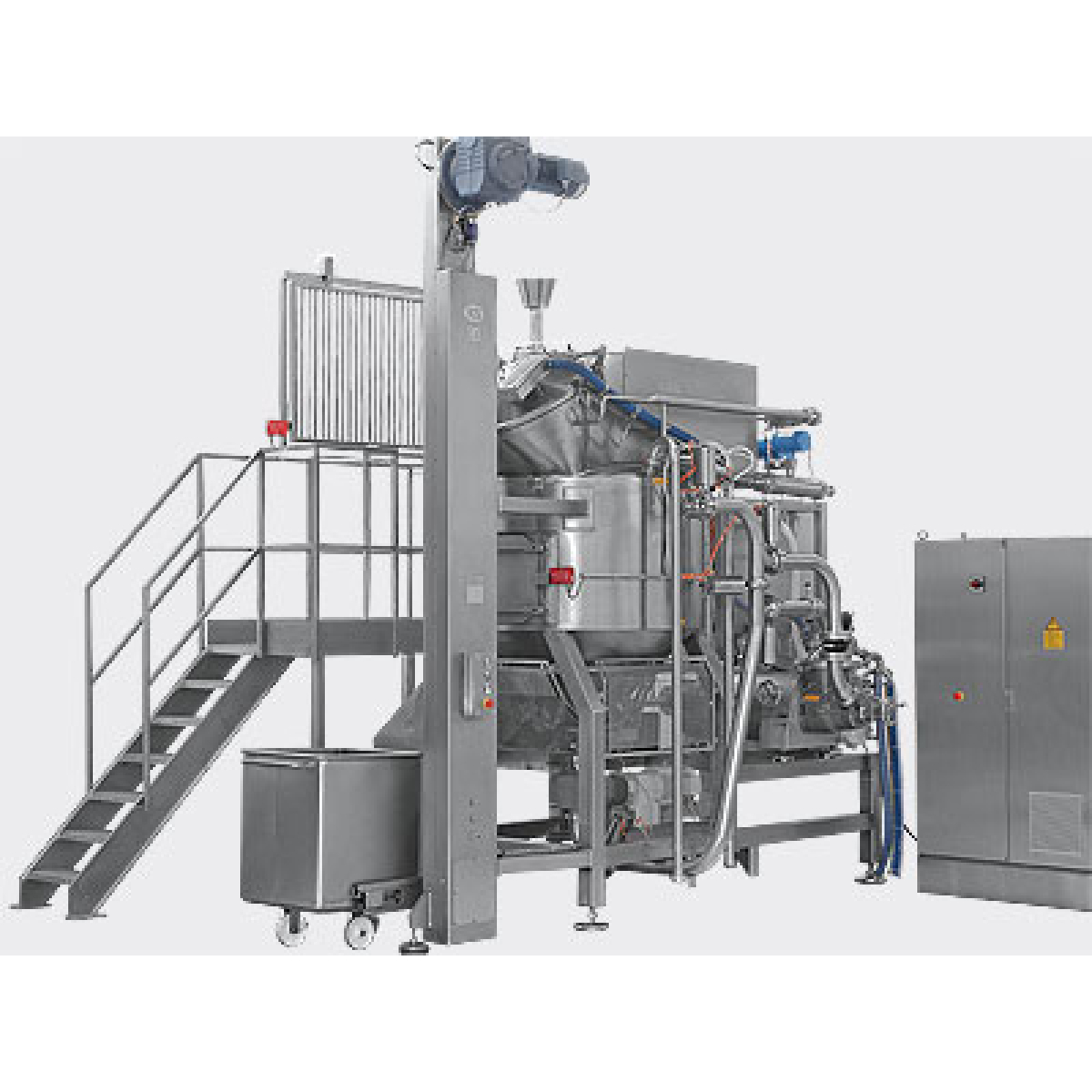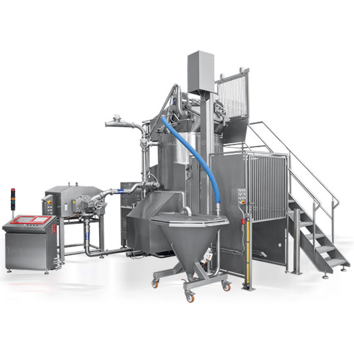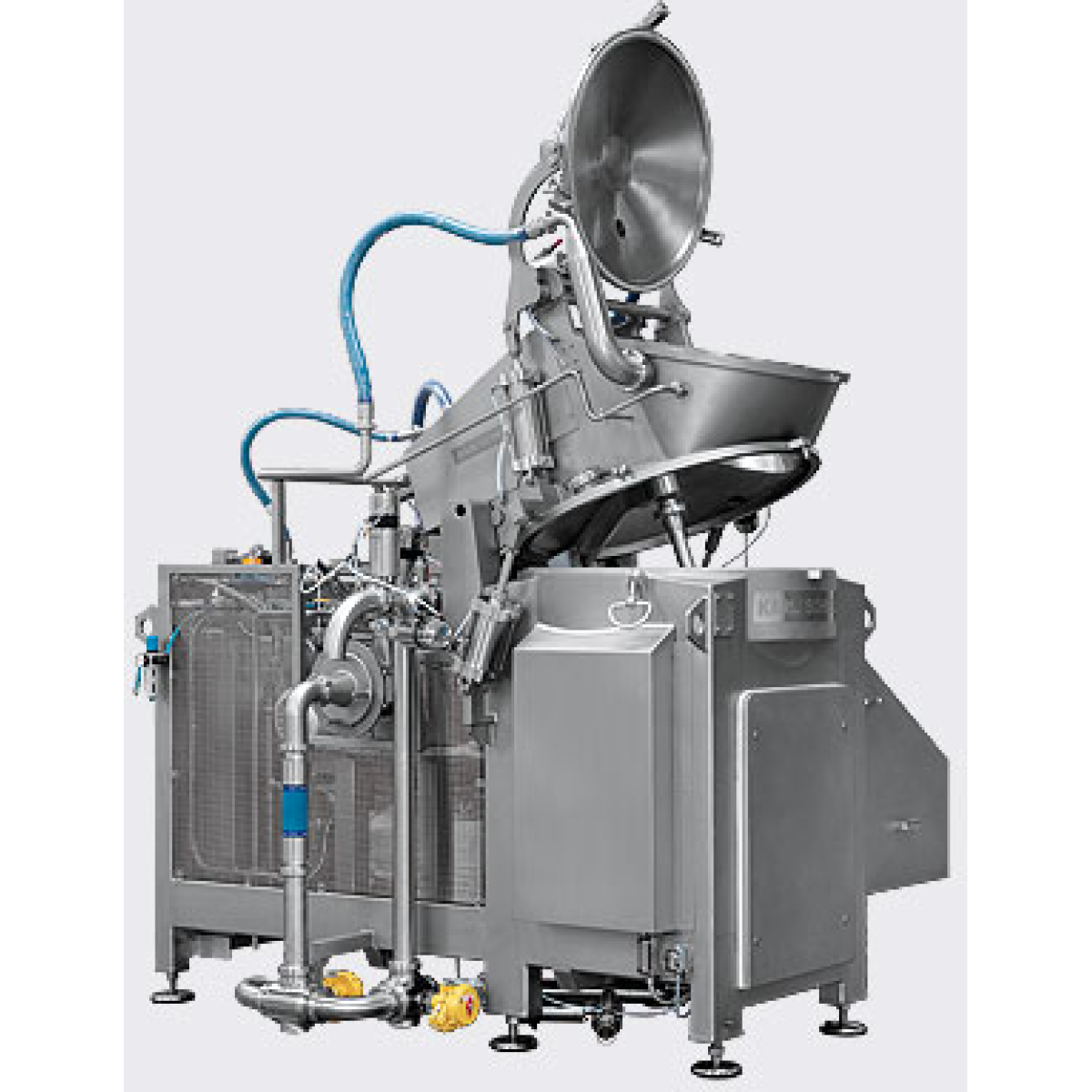 Вертикальный технологический бункер имеет двигатель предварительного измельчения с ножами для быстрого врабатывания порошкообразных продуктов или масла в водную основу.На крышке бункера установлен смеситель с системой очистки стенок. К коническому технологическому резервуару присоединен насос продукта, используемый для циркуляции продукта и для опорожнения. В режиме циркуляции продукт перекачивается через надежный эмульситатор KS, в котором производится тонкое измельчение, эмульгирование, гомогенизация, после чего он направляется назад в технологический бункер или выгружается. Выгрузка продуктов с кусковыми включениями выполняется в обход эмульситатора. Термические процессы проходят косвенно через двойной кожух и/или непосредственно через сопла впрыска пара. Исходные материалы загружаются подъемником со стандартными тележками, закачиваются посредством вакуума или подаются дозирующими насосами.
