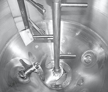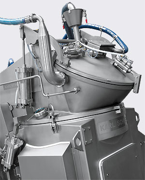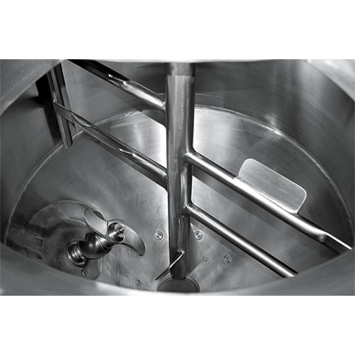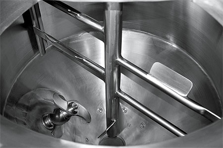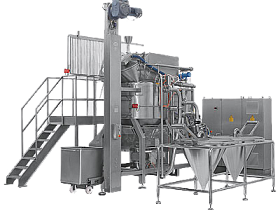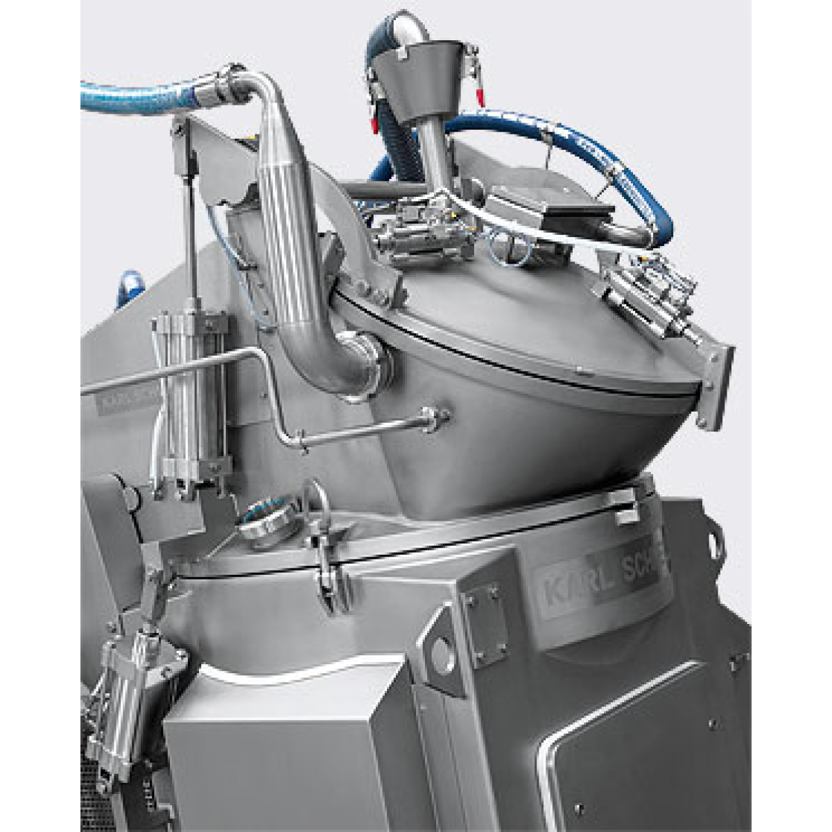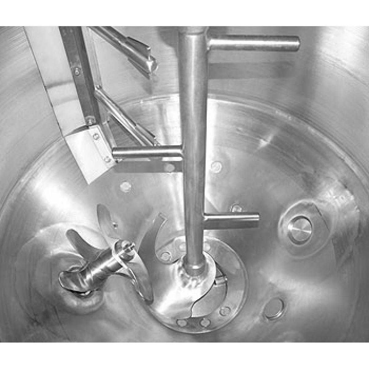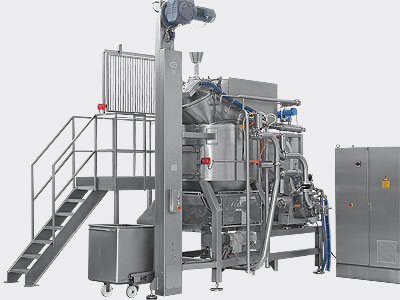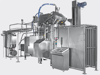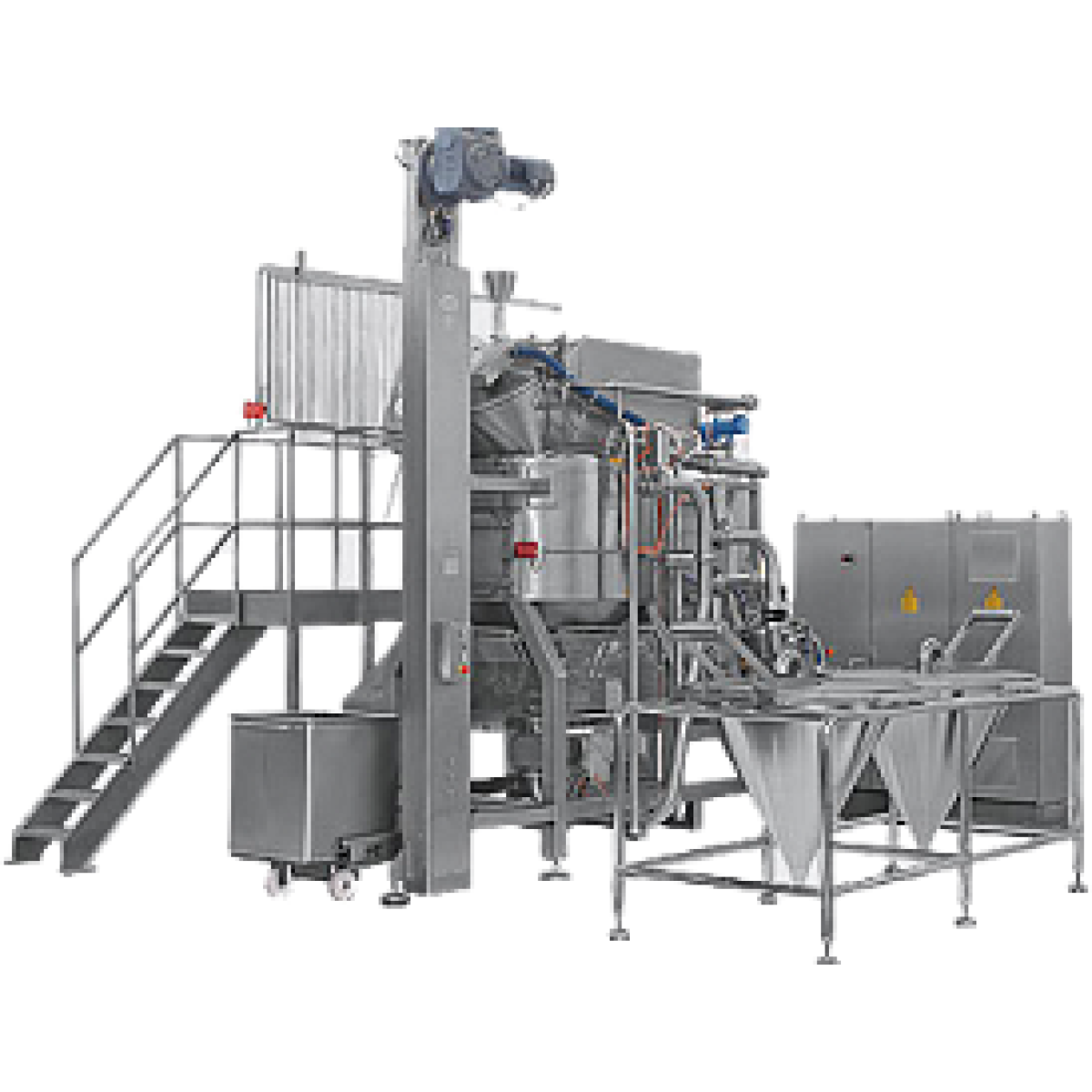 Вертикальный технологический бункер имеет двигатель предварительного измельчения с ножами для быстрого врабатывания порошкообразных продуктов или масла в водную основу.На крышке бункера установлен смеситель с системой очистки стенок. К коническому технологическому резервуару присоединен насос продукта, используемый для циркуляции продукта и для опорожнения. В режиме циркуляции продукт перекачивается через надежный эмульситатор KS, в котором производится тонкое измельчение, эмульгирование, гомогенизация, после чего он направляется назад в технологический бункер или выгружается. Выгрузка продуктов с кусковыми включениями выполняется в обход эмульситатора. Термические процессы проходят косвенно через двойной кожух и/или непосредственно через сопла впрыска пара. Исходные материалы загружаются подъемником со стандартными тележками, закачиваются посредством вакуума или подаются дозирующими насосами.