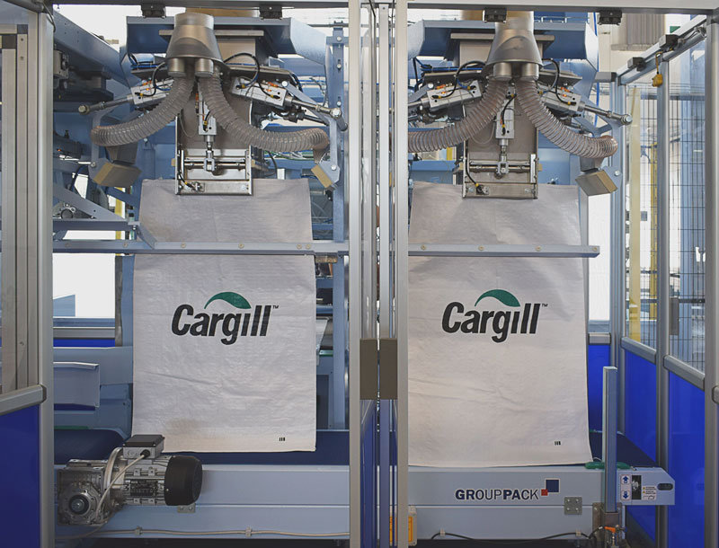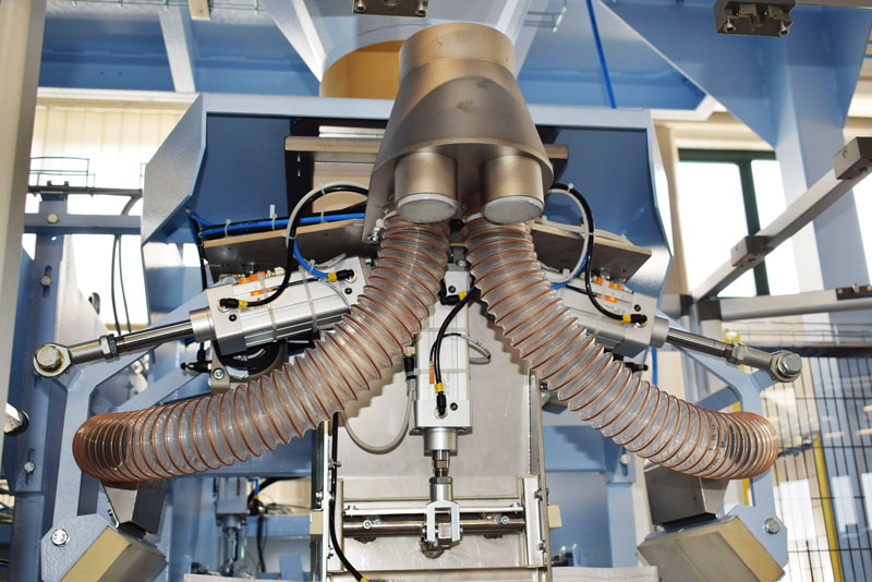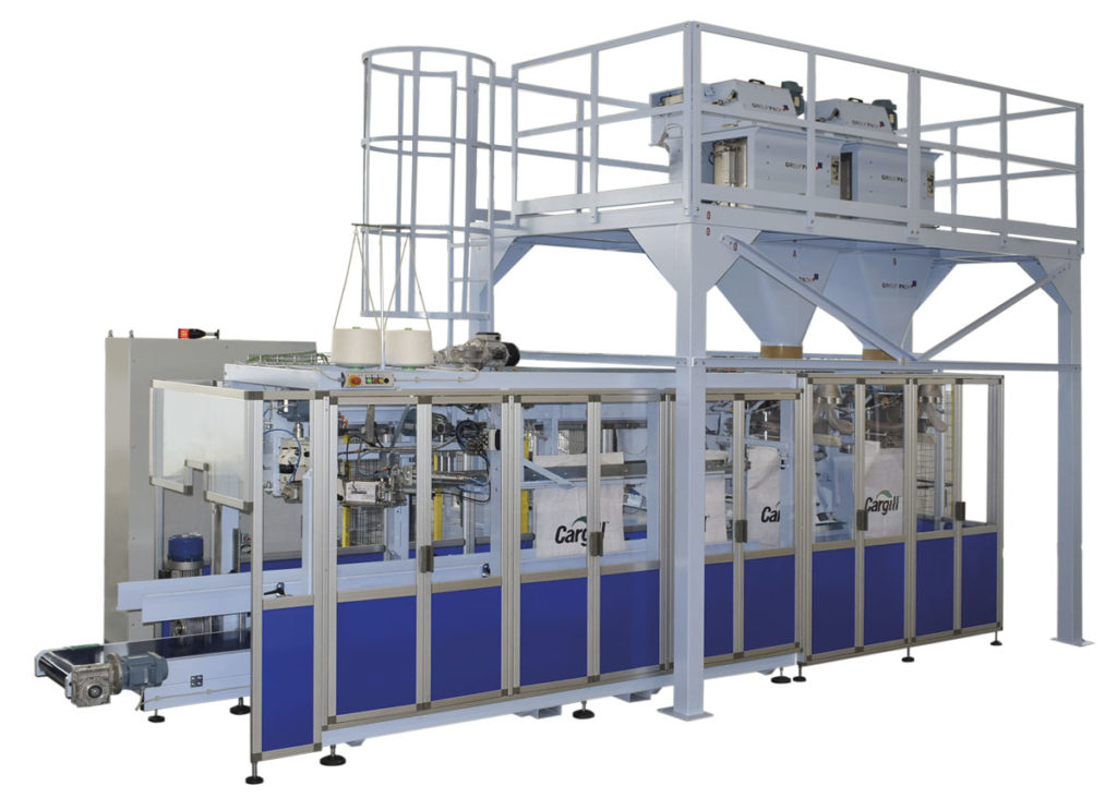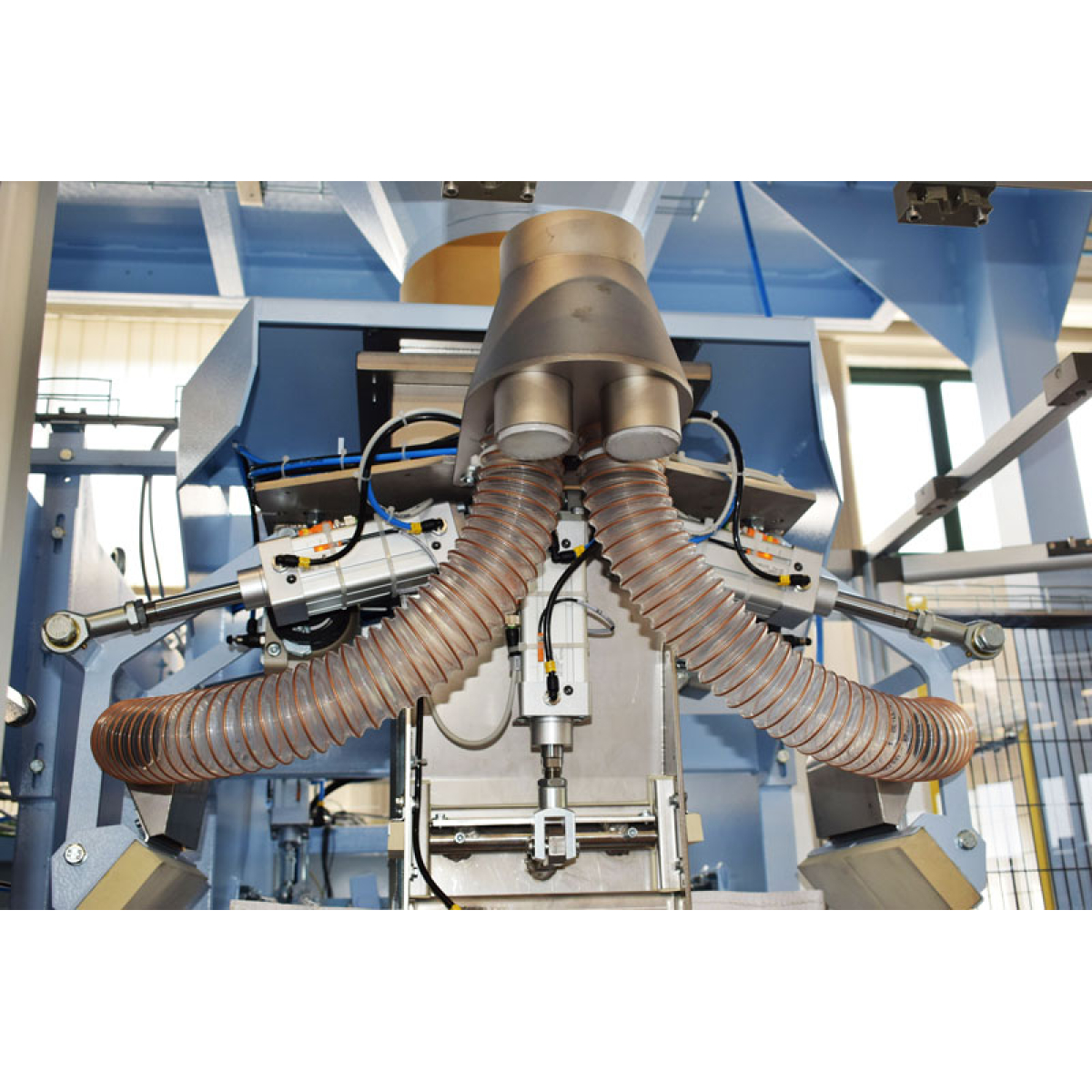 Упаковочная линия с двумя мешконаполнителями для дозы 10, 25 и 50 кг, для порошкообразных, гранулированных и кусковых продуктов. 1200 мешков в час