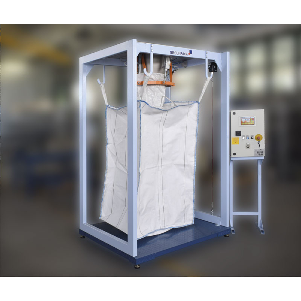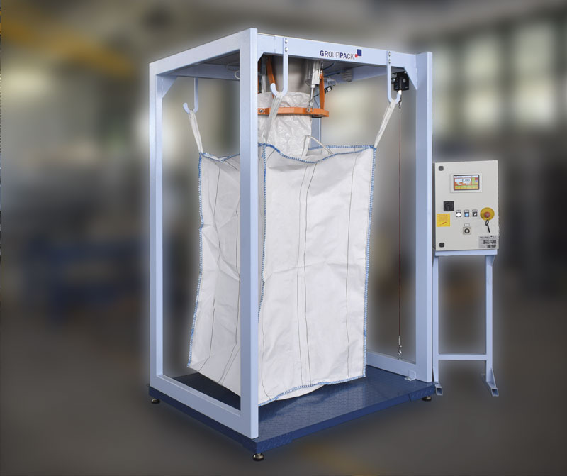 Полуавтоматическая весовая дозировка и наполнение биг-бегов весом 500 и 1000 кг с взвешивающей платформой, укомплектованной электронным оборудованием. 8 — 10 биг-бегов в час